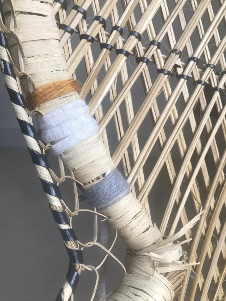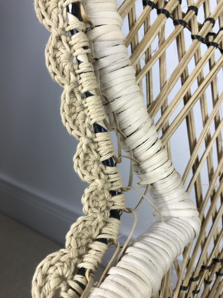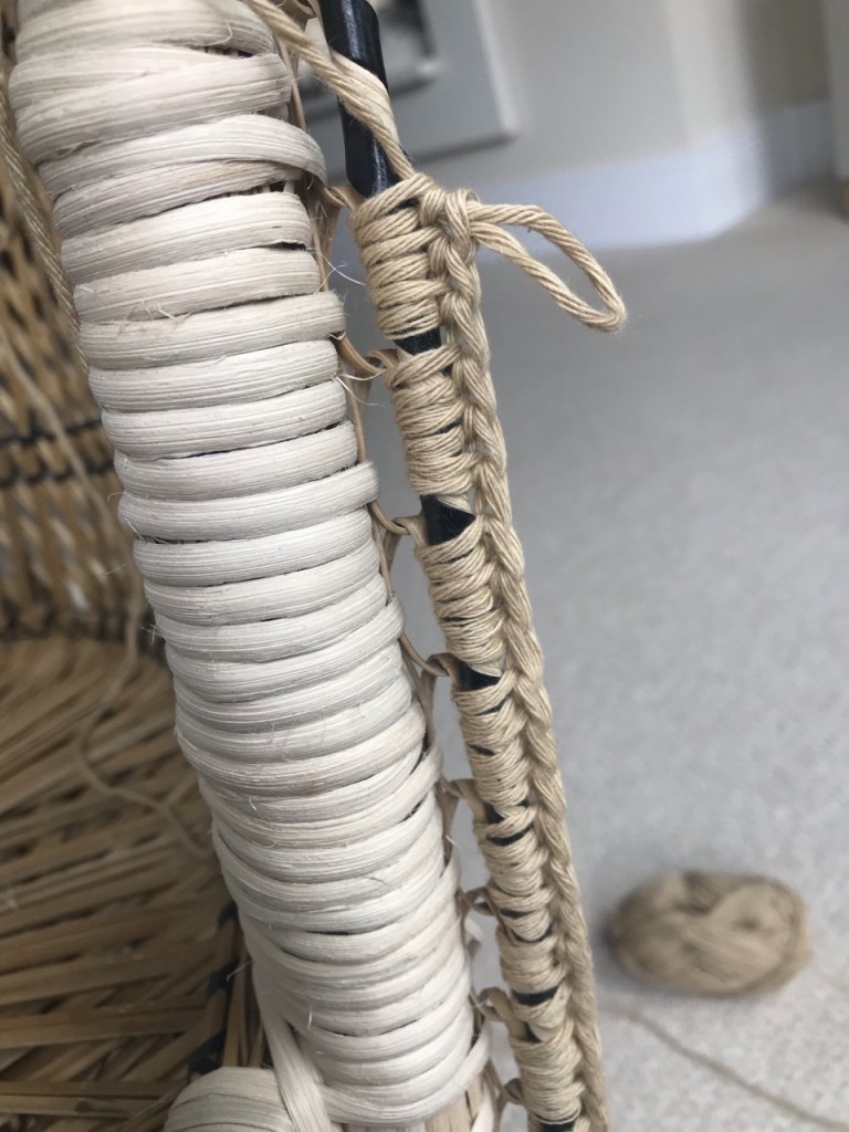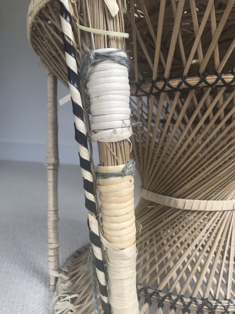The reed binding was damaged pretty much around every part of the chair. It all needed to be stripped off, damaged or otherwise, and re-wrapped. After A LOT of internet searching I eventually discovered that the original buri binding cannot be bought and so I needed to find an alternative. As the original reed binding was very thin and flat I thought that some sort of raffia might do the trick, and look pretty cool too. I tried natural raffia but this of course varies in width and I couldn’t get a neat finish on it, and I tried raffia yarn but this didn’t look right either. I was open to any type of finish and tried all sorts of craft items that I had at home too, including natural twine string, t-shirt yarn, floral bias binding, macrame cord and knitting yarn. I wasn’t happy with any of it.
