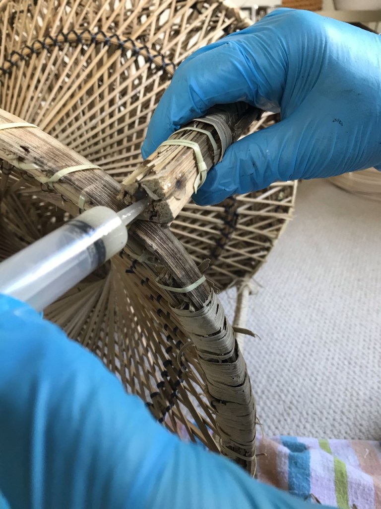Whilst the main area of concern visually was obviously the binding around the chair, the structure needed a little attention too. The chair legs were a little bit damaged and loose where they and been bound together at the bottom originally and just held in place on the base with one rusty nail. We made the bases of these legs more solid again by using a syringe filled with expoxy resin to bind the reeds together again into one solid mass, and when dry we were able to drill and screw these legs in place so that they felt nice and solid.