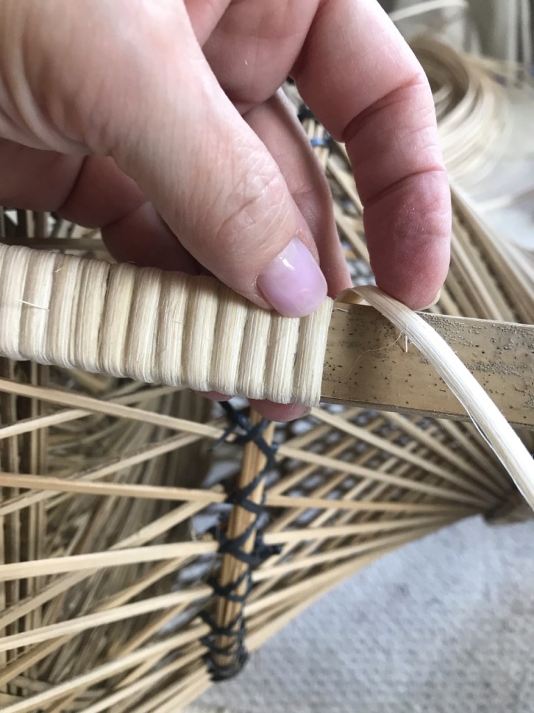 Every few inches or so around the edges of the chair there is a small black design which I wanted to keep. It’s just two strips of black plastic which is woven in and out of the binding. It can be a bit slippery to weave into the binding so I just held mine in place with a small strip of masking tape as I worked the design into my wrapping.