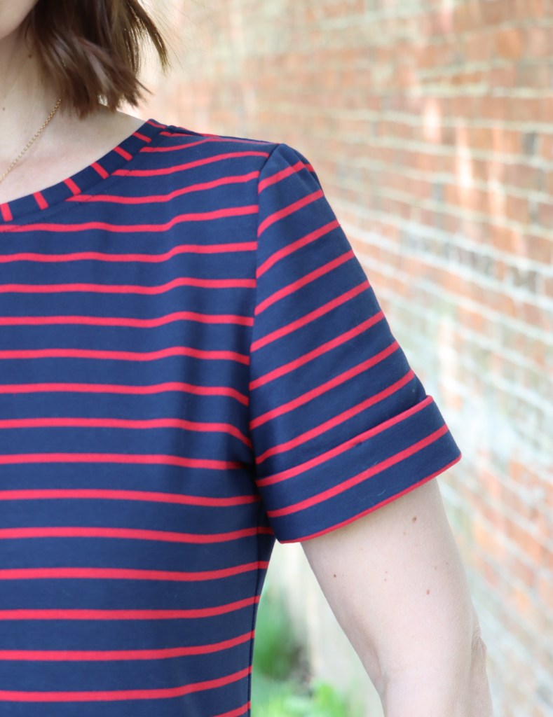 The fabric that I used is a gorgeous navy blue French Terry with a narrow red stripe that I bought from Emporia Fabric last Autumn at the Knitting and Stitching Show at Ally Pally. It’s a beautiful soft cotton and for those unfamiliar it’s like a lightweight sweatshirt fabric. I can’t see it on their website any more but it does look like they have something similar in the reverse colour way here which is a red background with thin navy stripes. For reference, the width of my fabric stripes are approx 15mm for the navy and 4mm for the red. You can’t beat a breton stripe can you!
