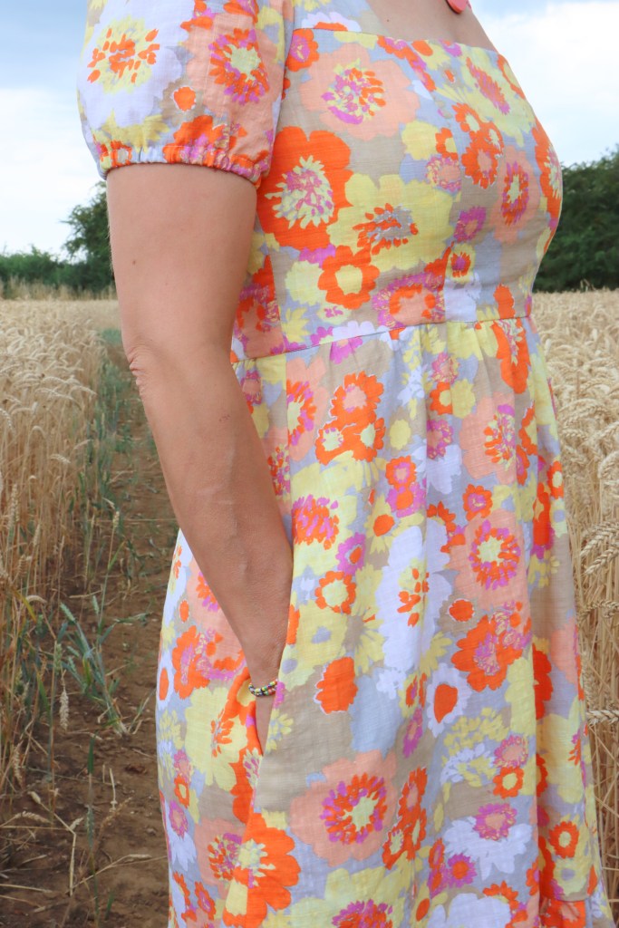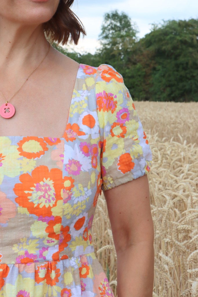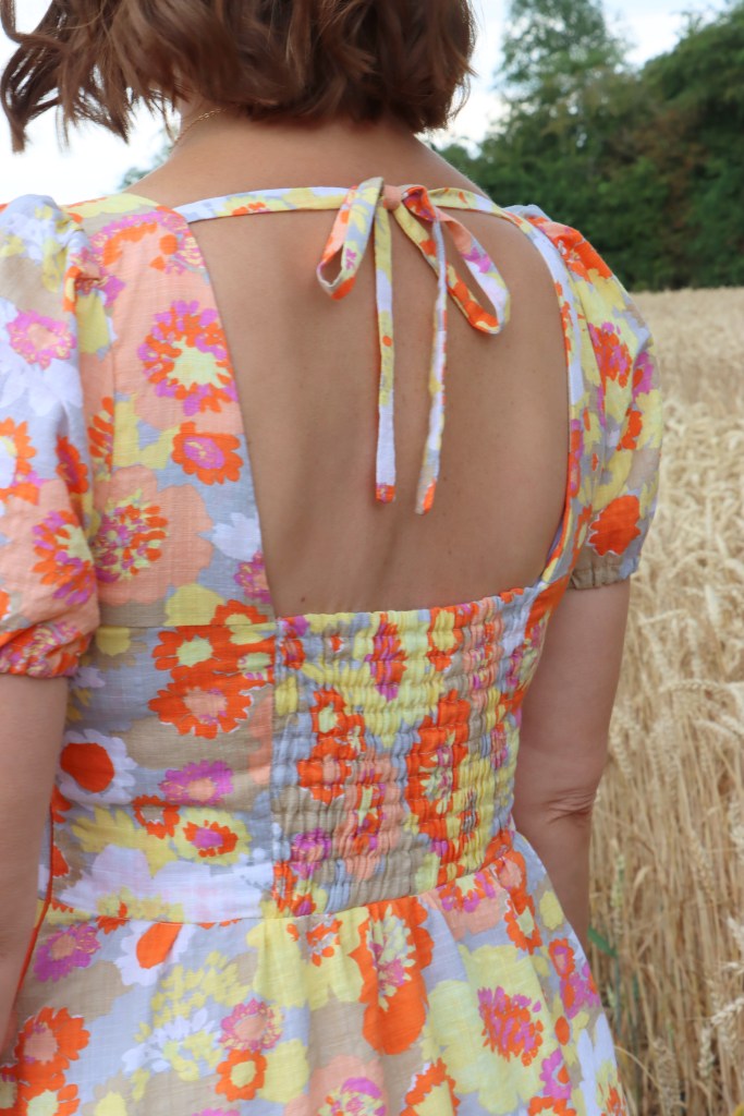 I love the square neckline front and back. Especially how the bodice has shaped yoke pieces giving it a gentle curve up from the horizontal part of the neckline which is so flattering and also means that your bra straps don’t show. Actually, let’s be honest, when I first tried this dress on my straps did show a little, but a quick change into another and this was fine.