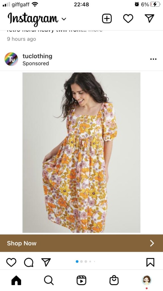 This month’s dress is heavily influenced by Instagram, but not from one of the lovely accounts that I follow, from one of those annoying ads that pop up in your feed. I kept on seeing this square neck dress from Tesco’s made in a stunning yellow and orange vintage style floral print, and I could not get it out of my head. I even saw a lady wearing it one day when I was out and that was it, my mind was made up, I was going to treat myself to it.