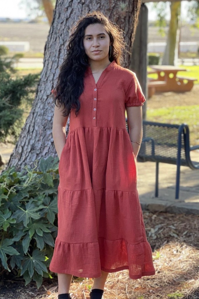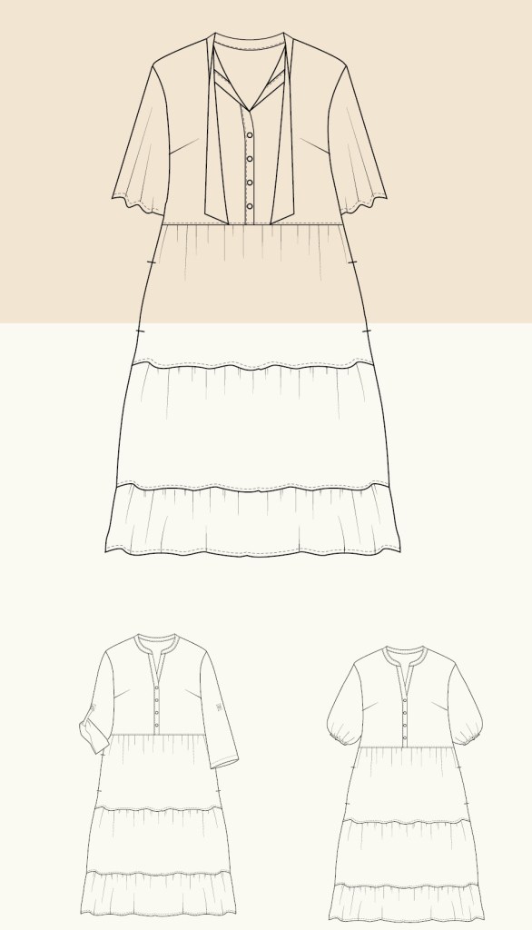 This pattern comes with several different options including sleeve choices (or sleeveless), neckline variations, and skirt tier lengths. It is sized for 0-24 (bust 30.5 - 48.5), and it’s the perfect pattern for drapey woven fabrics.
