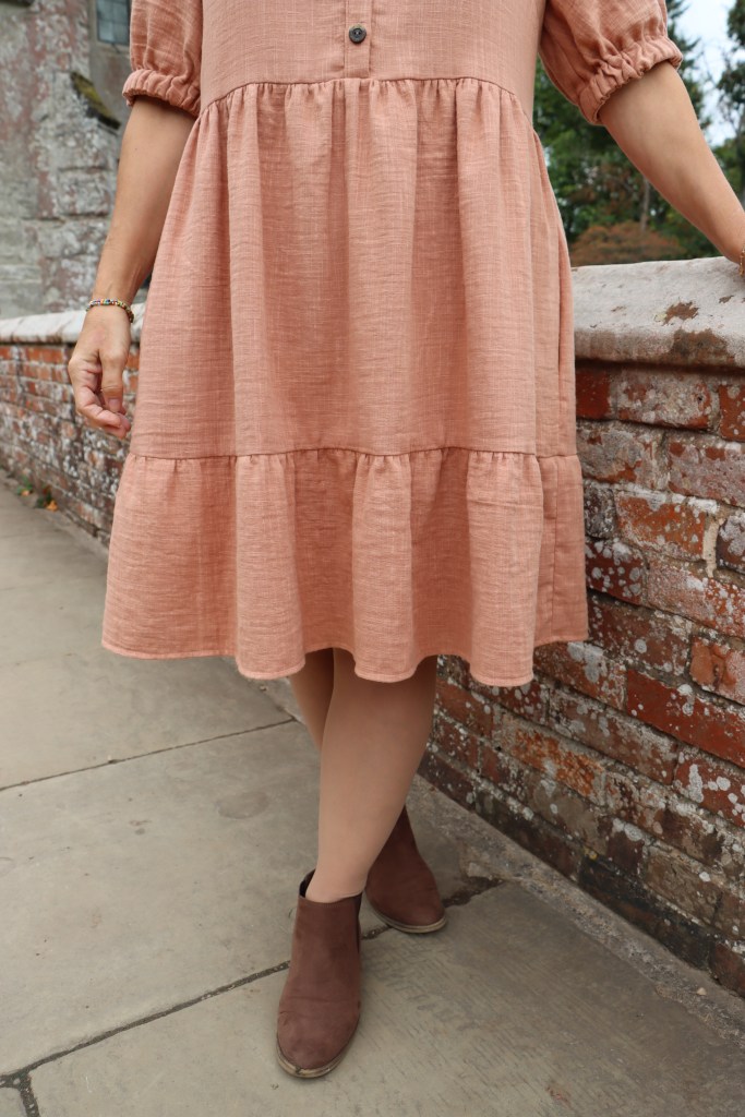 Although there wasn’t too much of this light teracotta coloured double gauze left, and what was left was cut into two pieces, I hoped that I would be able to squeeze a Freedom Dress out of it - with a bit of jiggling around. As you can see it worked and although the skirt pieces needed a bit of improvisation (more about that later), I’ve ended up with a beautiful new dress. Not to worry that Summer has now passed and we are charging through Autumn, I feel that the cosy nature of double gauze will be suitable for these mild Autumn days, and equally suitable to be worn with sandals or tights and boots!